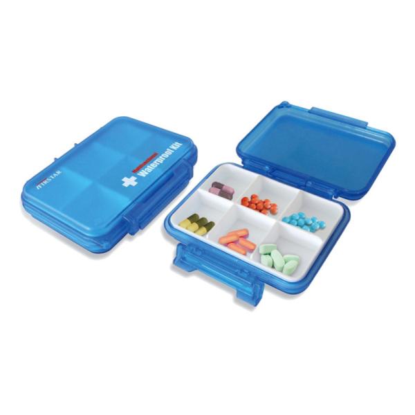 Waterproof first aid kits with variety colors and removable pill trays in side, ideal for travel use. The medicines can be put on the trays and some adhesive band aids and alcohol prep pads can be put on the bottom of the tray. The silicone seal makes the pill box waterproof.
